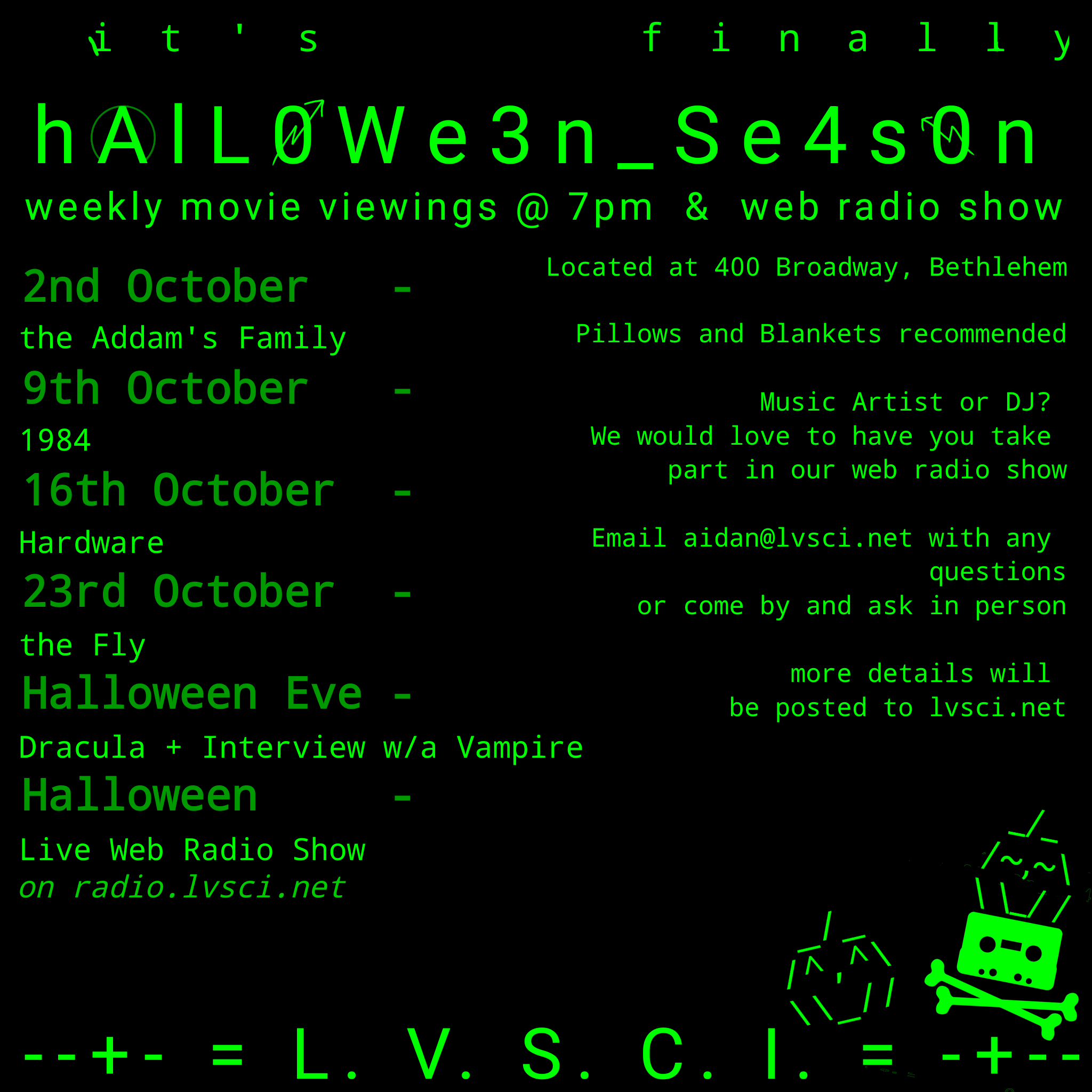 Weekly social and movie nights at Uncle Aldo’s on thursday at around 7pm. Ending with a radio show on LVSCI Webradio.